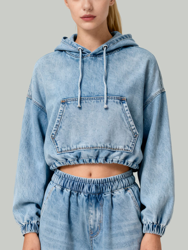 Light Blue Denim Cropped Hoodie with Front Patch Pocket